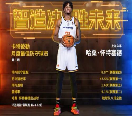 体育播报4月1日宣 CBA官方宣布,上海男篮外援怀特塞德当选本赛季第三期月最佳防守球员。