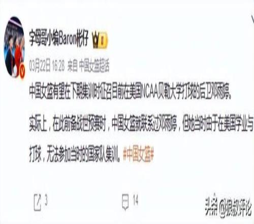 中国女篮方面,有媒体人报道,她有望在下期集训时征召目前在美国NCAA贝勒大学打球的后卫邓雨婷。