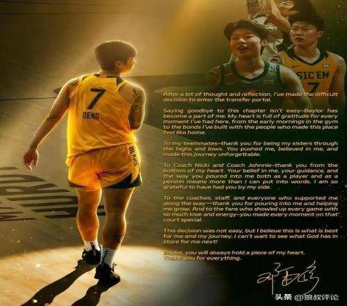 北京时间4月3日,根据女篮球员邓雨婷社媒发文:即将离开贝勒大学,进入转校的话题引发外界的热议。