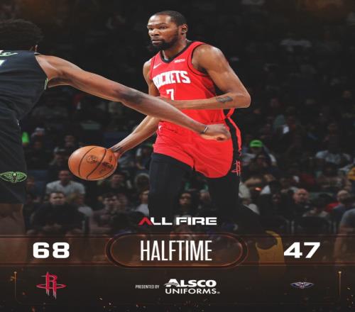 火箭队的申京上半场得到20分、8个篮板和5次助攻,史密斯得到13分,杜兰特得到12分和4次助攻;鹈鹕队的穆雷得到13分。
