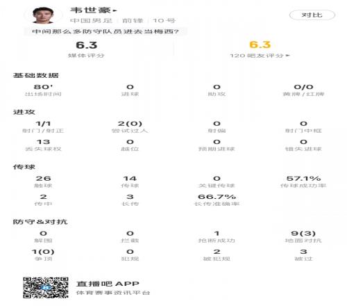 韦世豪第80分钟被换下场,本场贡献国足唯一一次射正
