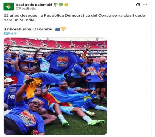 贝蒂斯官方更新社媒动态,对队内的民主刚果前锋巴坎布表示祝贺:“时隔52年,民主刚果再次晋级世界杯,恭喜你,巴坎布!”