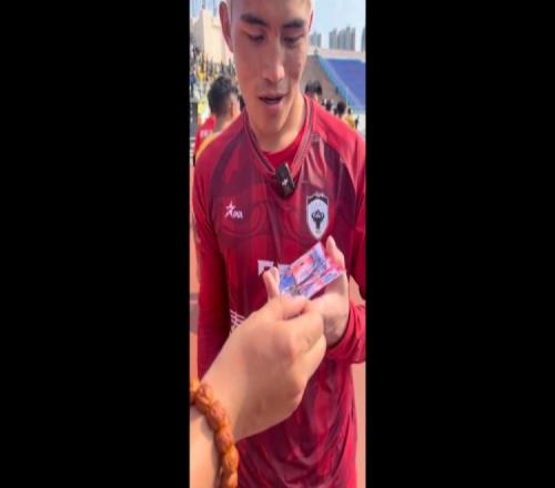 体育播报4月1日宣 4月1日,2026泰山好水CMG群众足球邀请赛小组最后一个比赛日,山东泰安队2-2战平青海玉树队,记者牛志明赛后向玉树队门将索南龙周赠送王大雷签名照。
